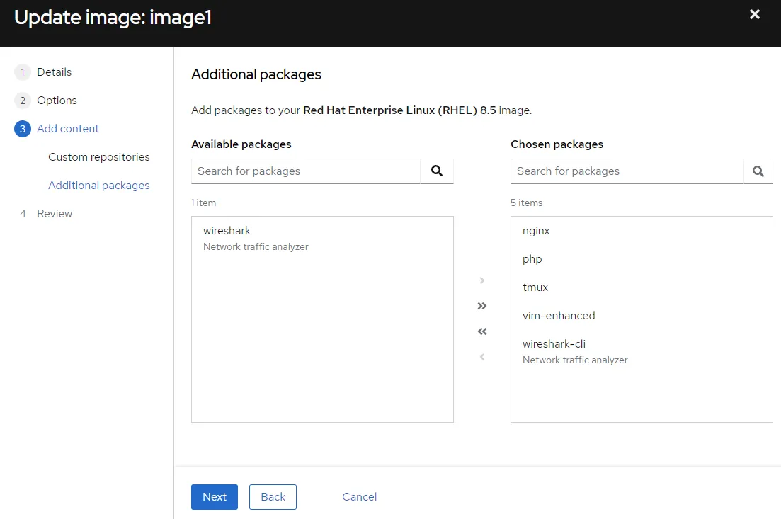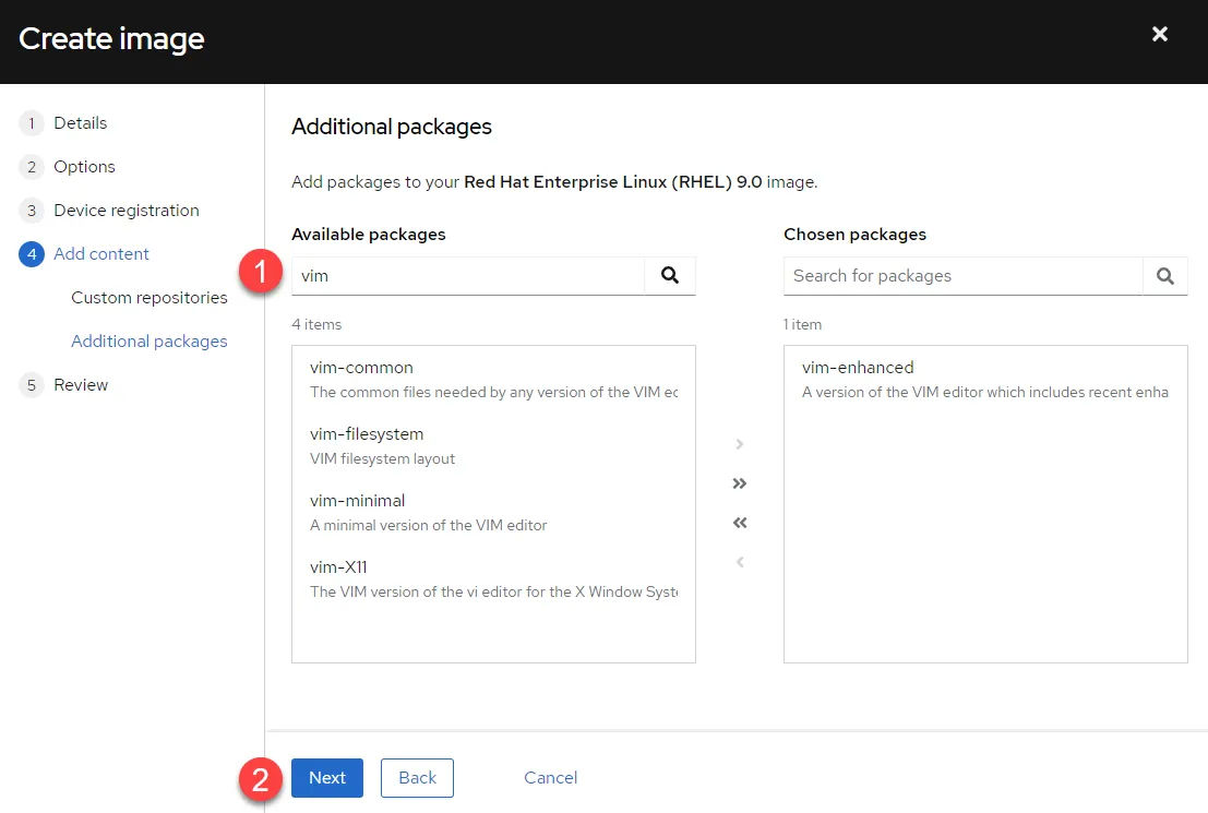 In the “Additional packages” menu, add the “vim-enhanced” package to the image. This menu is where we customize the software we want to install in our image.