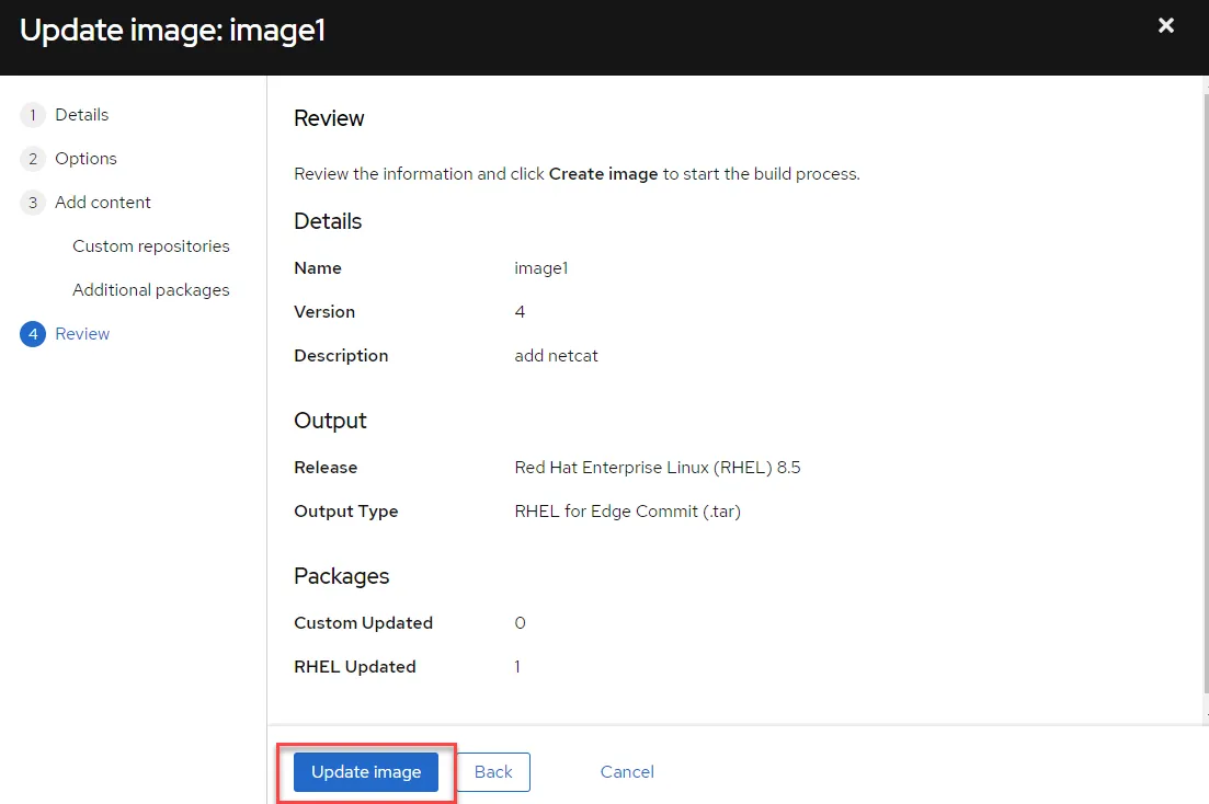 Finally, review the configuration of the image. Click the “Create image” button to create the image.