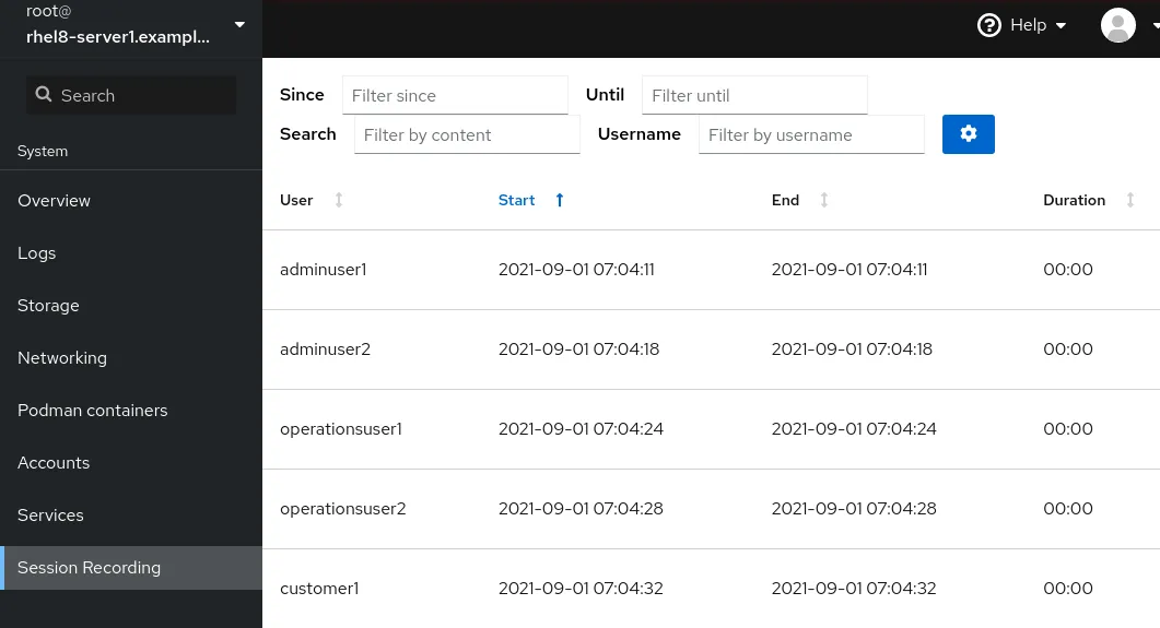 On rhel8-server1, all five users (adminuser1, adminuser2, operationsuser2, operationsuser1, and customer1) log in, and each of them receives a notification that their session is being recorded, which matches the desired configuration. I can also validate that I can view the recordings in the Web Console on rhel8-server1 for each of these users: