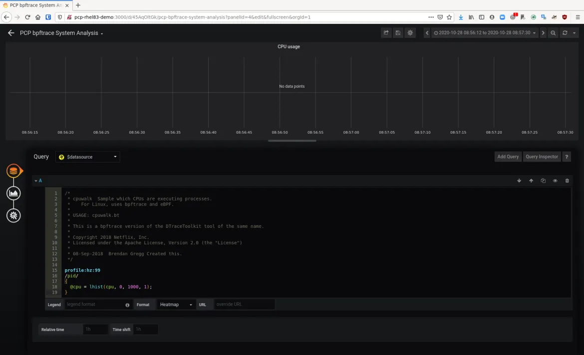 Further, enabling pcp bpftrace in Grafana requires creating a ‘metrics’ user for Grafana that can run any valid bpftrace script as root! You would want to steer away from doing this in production. Further in this post, we’ll cover how to use bpftrace scripts with pcp and Grafana in production.