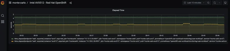 The Red Hat monitoring stack (which is part of Red Hat OpenShift) was used to monitor the user application and capture the elapsed time to complete the simulation on both AVX2 and AVX512 configurations. For more information on the RedHat “Monitoring stack”, please refer to the Red Hat OpenShift release notes and documentation.