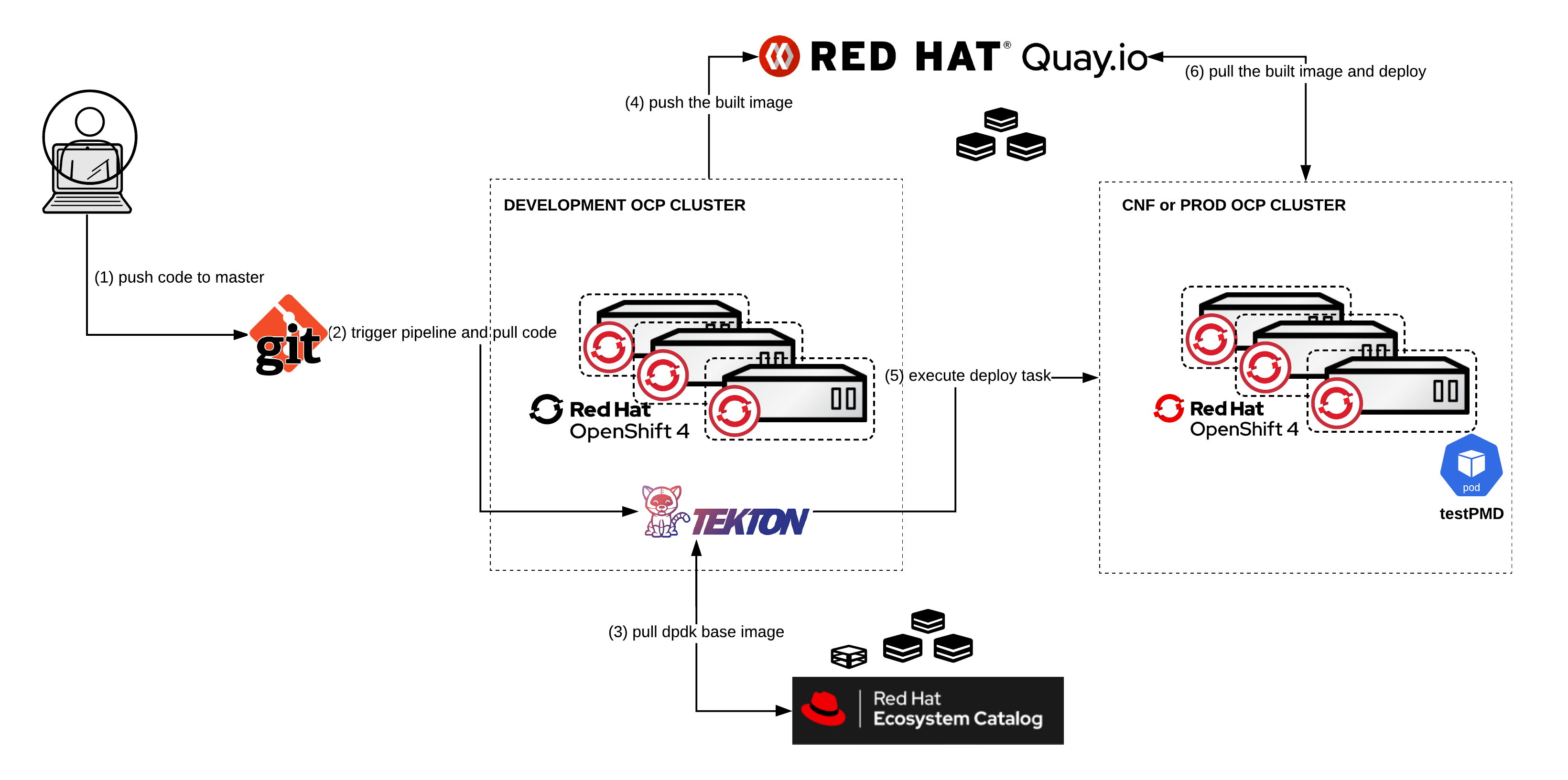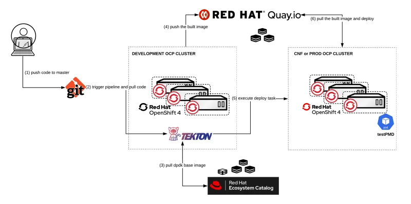 In this task, a continuous deployment (CD) process driven by cloud-native CI/CD on OpenShift called OpenShift Pipelines will assist us. As an example application that requires DPDK libraries and Multus/SR-IOV, we are going to build testPMD. TestPMD is an application used to test DPDK in a packet forwarding mode and also to access NIC hardware features such as Flow Director.