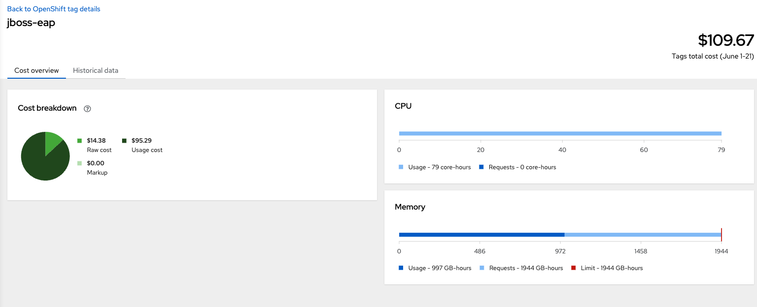 https://console.redhat.com/api/cost-management/v1/reports/openshift/compute/?group_by[tag:costmanagement_tracking_software]=*&filter[resolution]=daily&filter[time_scope_units]=day&filter[time_scope_value]=-90 - To fetch daily usage information for all loads tagged with the costmanagement_tracking_software=jboss-eap tag/value pair, for the last 90 days: