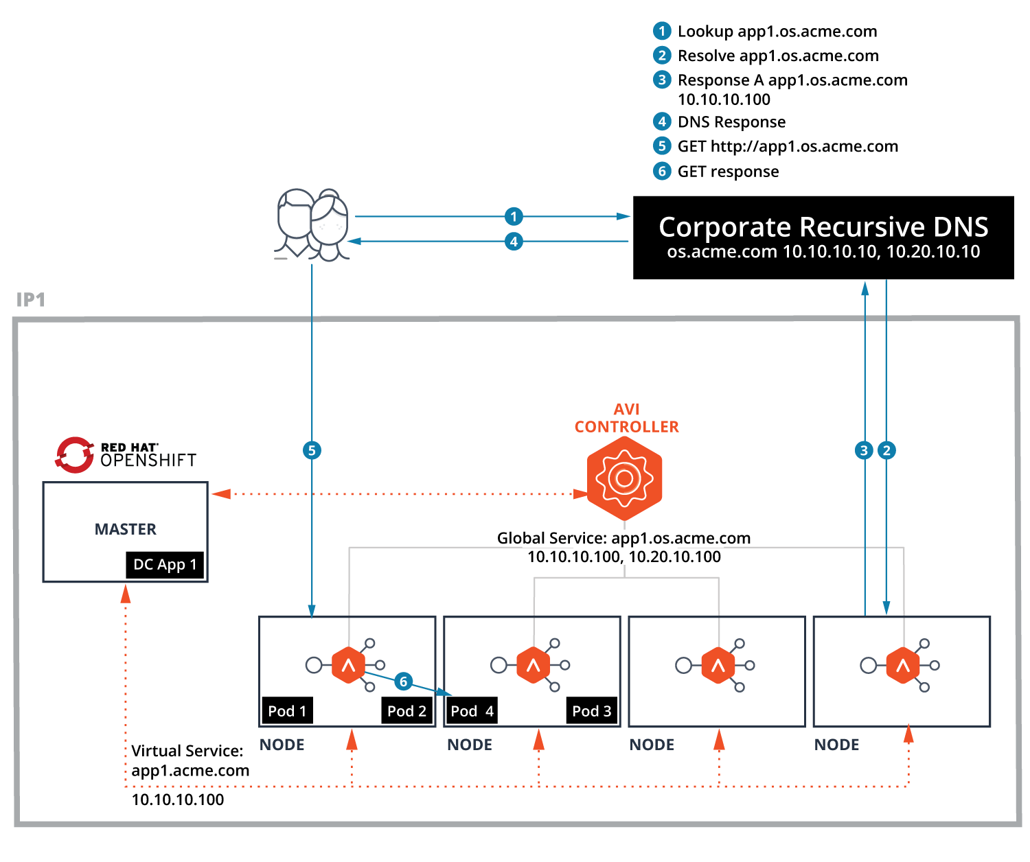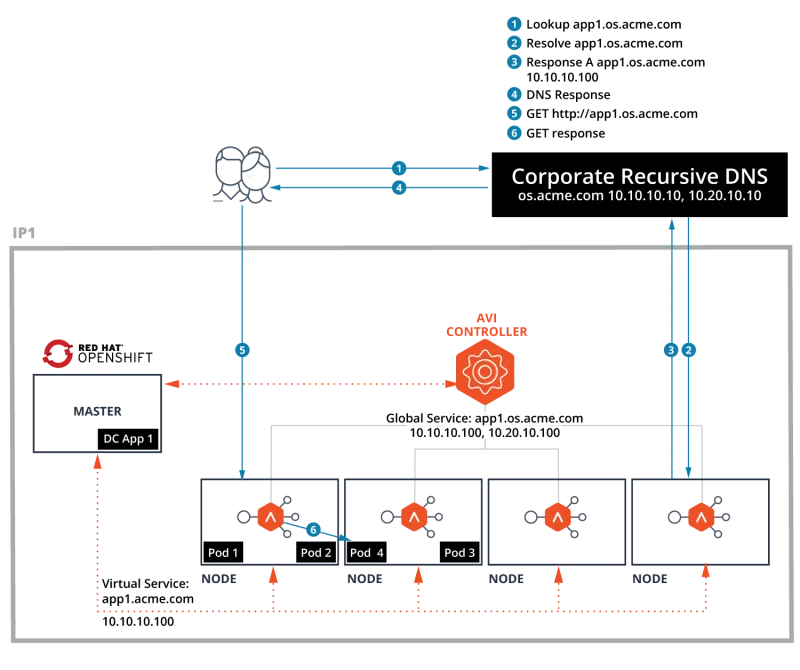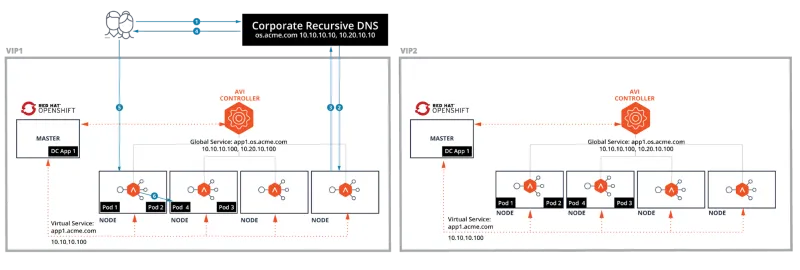 The global application app1.os.acme.com is associated with 2 Virtual IPs (10.10.10.100 and 10.20.10.100) belonging to the 2 clusters in different zones/regions. Data Center 1 has VIP1 10.10.10.100 and Data Center2 has VIP2 10.20.10.100. When the user does a DNS lookup for app1.os.acme.com, the user is returned an A record with either 10.10.10.100 or 10.20.10.100 depending on: