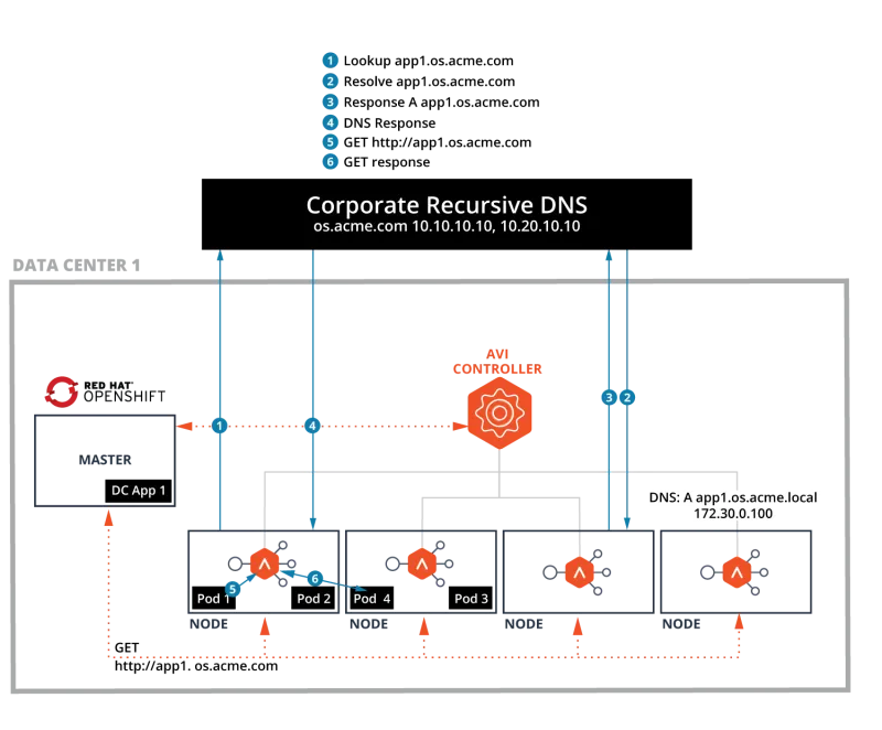 Avi Vantage provides an authoritative DNS server for users’ devices and other services to map host/domain names to virtual IP addresses (VIPs). Every service, route, and an ingress object creates an A record in Avi’s DNS server mapping the service’s host/ domain name to its VIP. Usually, the cluster’s sub-domain is delegated at the corp or datacenter DNS to Avi’s DNS server.