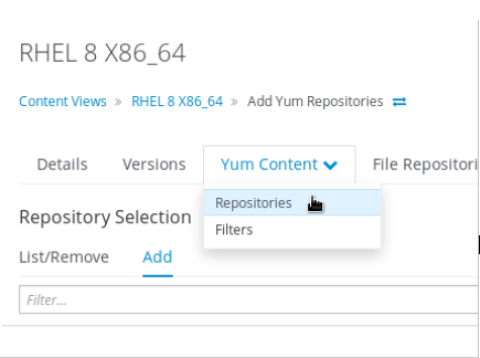Select an existing content view by going to Content -> Content Views. Select the content view to be updated, and when that view opens, select the Yum Content tab and Repositories shown in the example here: