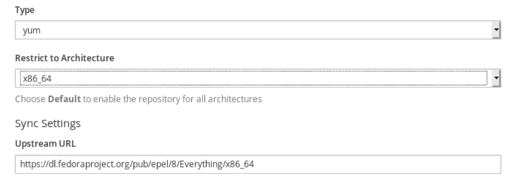 After selecting yum, additional dialogs will open for completing the repository setup. In our example, we will restrict this setting to the x86_64 architecture by selecting that from the drop-down: