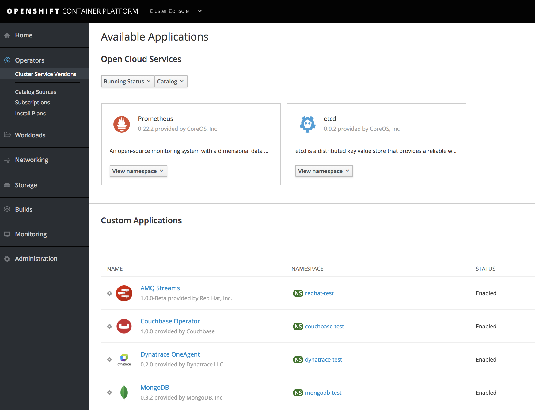 These Operators have been validated to work for non-production use cases with Red Hat OpenShift, and like all Operators, on any Kubernetes cluster. In OpenShift Container Platform 3.11, installation, management, and dependencies for the Operators themselves are handled by the Operator Lifecycle Manager (OLM) from the Operator Framework (OLM is shipping as Tech Preview in OpenShift Container Platform 3.11).