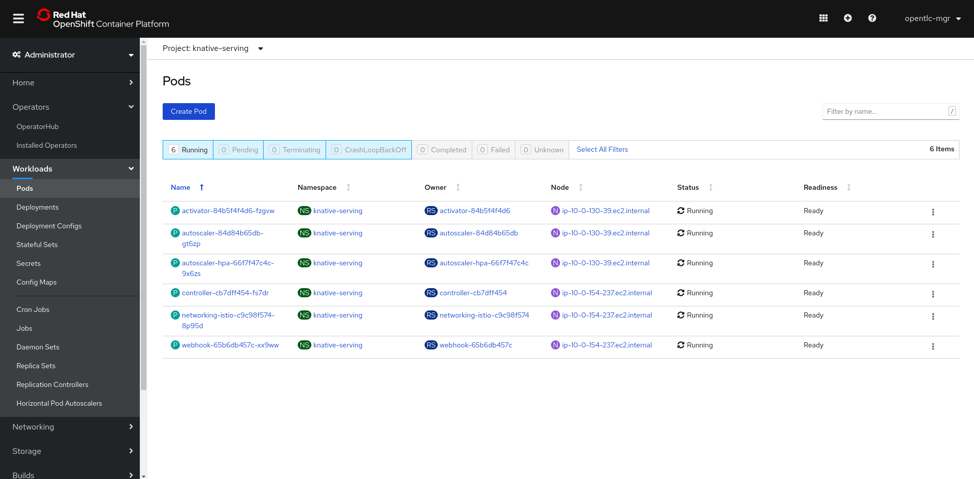 - After creating the Knative Serving object, navigate to the Workloads -> Pods view and wait till all pods are in Running state.