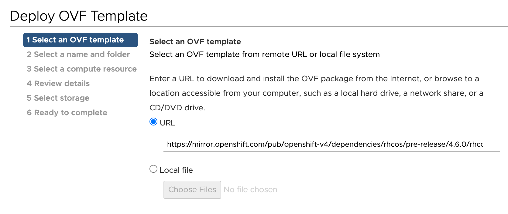 govc import.ova --folder=templates --ds=spc500 --name=rhcos-4.6.1 https://mirror.openshift.com/pub/openshift-v4/dependencies/rhcos/4.6/4.6.1/rhcos-vmware.x86_64.ova