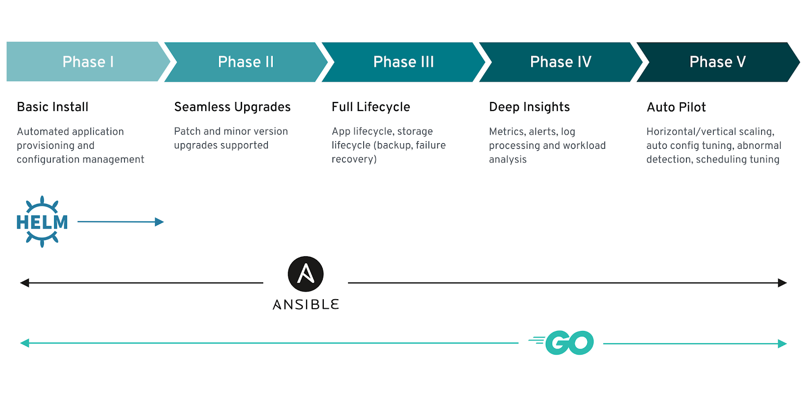 Early stage Operators handle basic functionality like automated application provisioning and configuration management, while fully mature Operators will be able to react to failures automatically based on abnormalities.