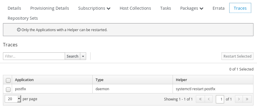 If we go to “Hosts”, “Content Hosts” in the Satellite web interface, click on this host name, and go to the “Traces” tab we can see more details: