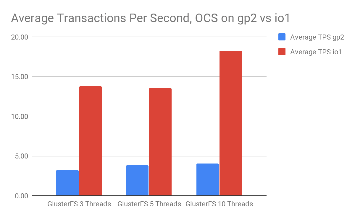 In the “OCS on gp2 vs io1” graph, the “Average TPS” value is the average of the results we got from the 60 individual pods using sysbench default read/write parameters (70% reads, 20% writes, and 10% other). In this setup, using EBS io1 storage instead of GP2 storage for the OpenShift Container Storage cluster, we repeated the tests described in the preceding for both GlusterFS and GlusterBlock PVCs. The following graph shows the difference between using EBS GP2 vs io1 when running 60 pods (MySQL/sysbench) similar to as before. The following values are TPS per pod averages for each storage type: