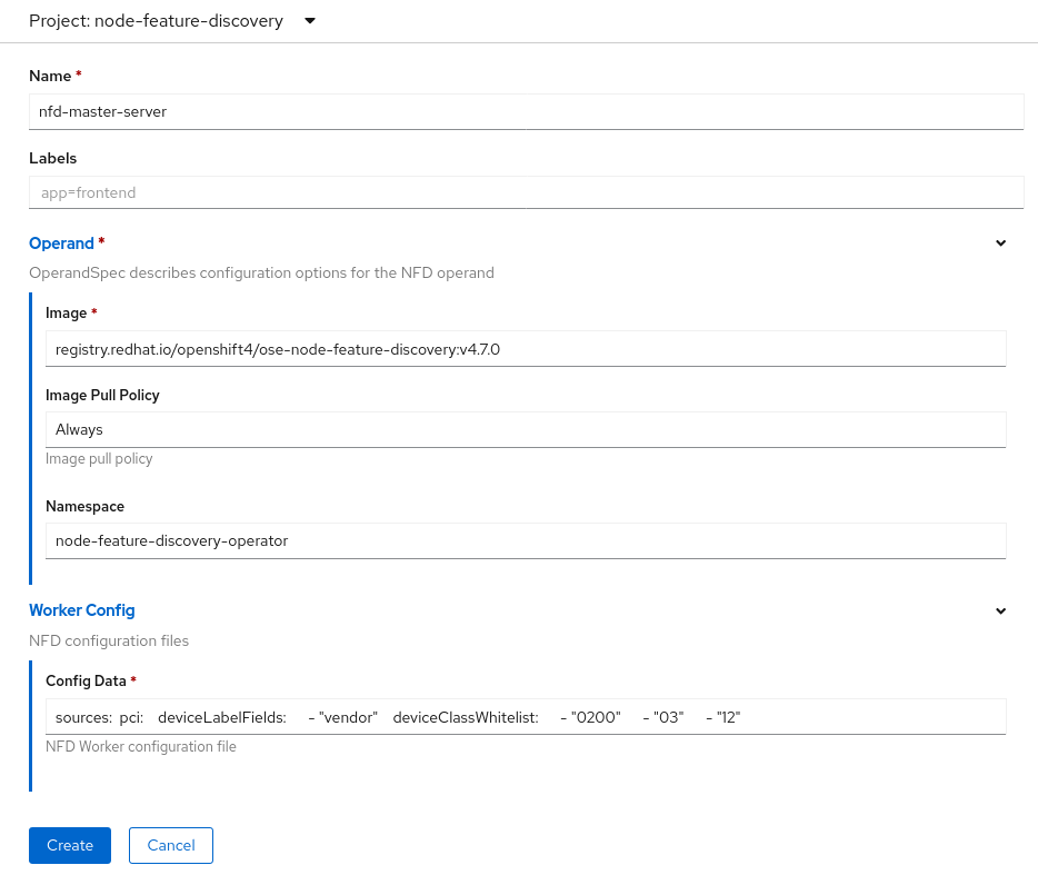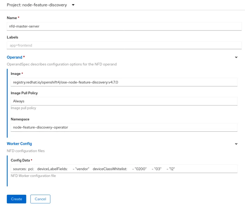 You can also see that the web form has a new entry from the previous 4.6 version, the “Worker Config.” Now users can define the nfd-worker.conf file from the beginning when installing NFD from the web console and will be able to edit it as necessary by simply editing the NFD custom resource.
