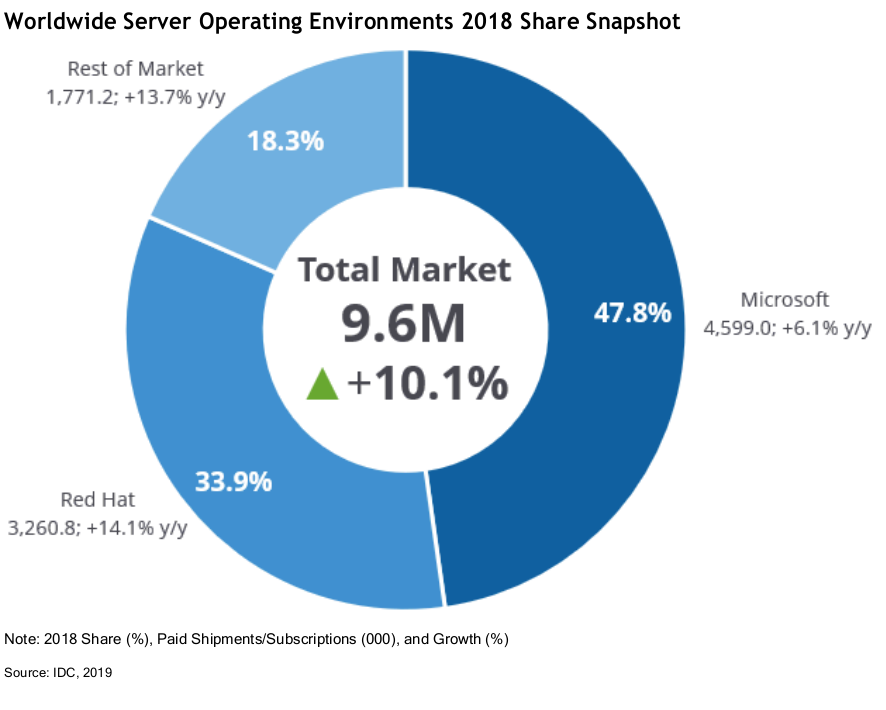 - Paid Linux subscriptions made up more than 51% of worldwide commercial server operating system deployments in 2018.