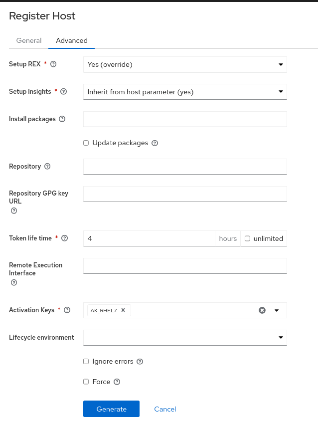 On the Satellite, go to “Hosts->Register Host” and fill in the following two screens: