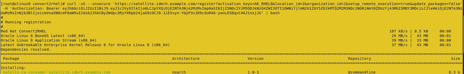 [root@olinux8 ~]# cat /etc/yum.repos.d/convert.repo [convert-to-rhel] baseurl = https://satellite.idmrh.example.com/pub/convert2rhel/8/ sslverify = 0 name = Red Hat Convert2RHEL enabled = 1 gpgcheck = 0