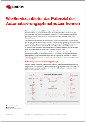 Die zunehmende Automatisierung bei Deployment, Betrieb und Management von Netzwerken und Services ist entscheidend für eine schnellere Markteinführung neuer Services. Darüber hinaus kann die Ausführung von Automatisierungsprozessen in großem Umfang die Betriebskosten (OpEx) erheblich senken und den Umsatz steigern. Lesen Sie mehr darüber, wie Red Hat® Ansible® Automation Platform vollständig unterstützte Funktionen für Serviceanbieter bereitstellt.