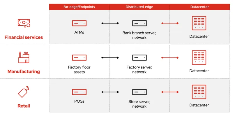 Red Hat's vision for edge computing addresses the edge use case as a solution to many problems. Challenges will be different depending on the use case, as well as the number of devices and their location or proximity to the main central datacenter. Let’s refer to the following diagram to visualize the edge layers and observe where edge devices could be located: