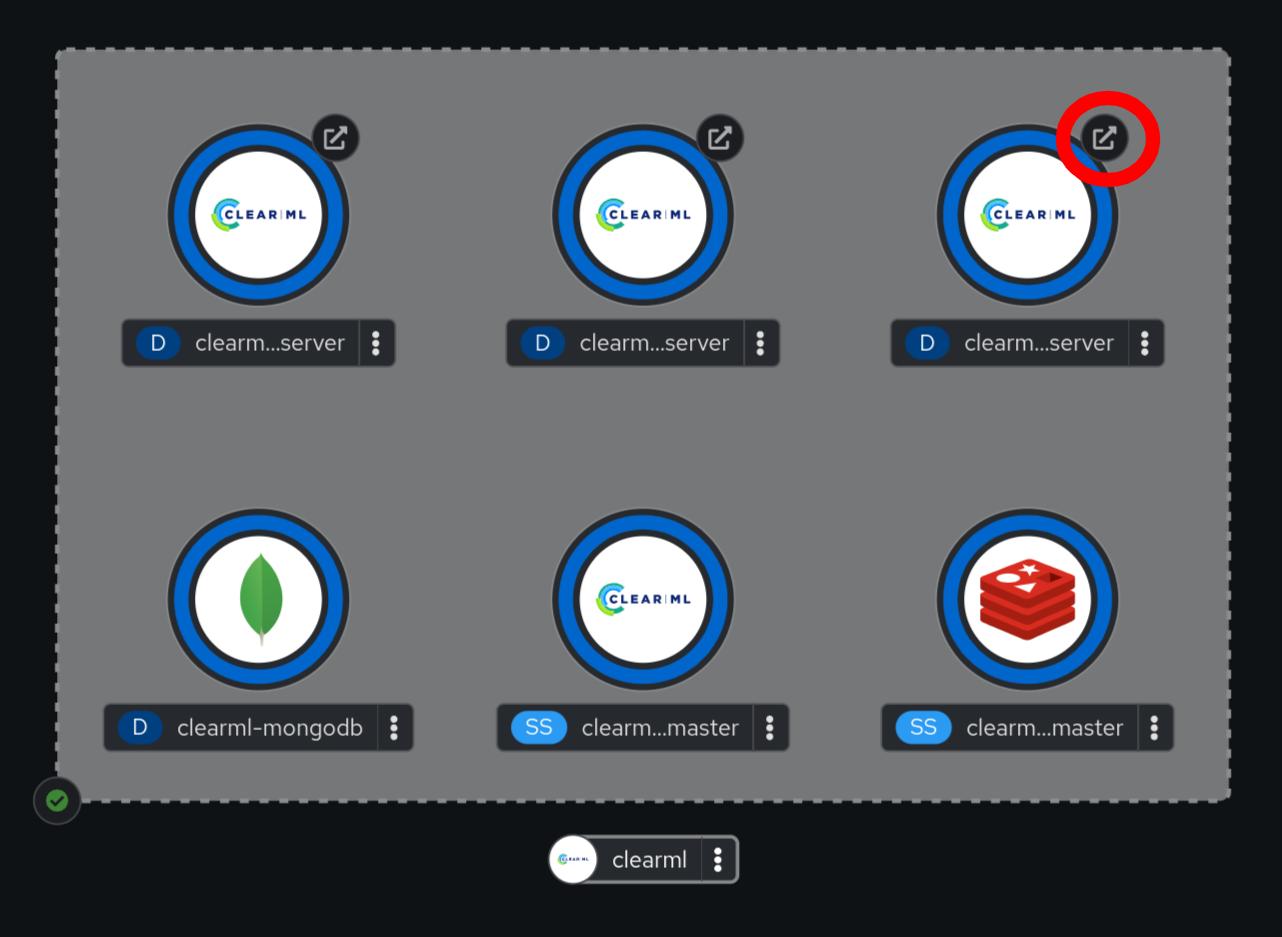 The OpenShift topology view makes it easy to access applications that are exposed outside the cluster: Just click the little icon (circled in red above) for the clearml-webserver deployment, which will open its URL in a new browser tab.