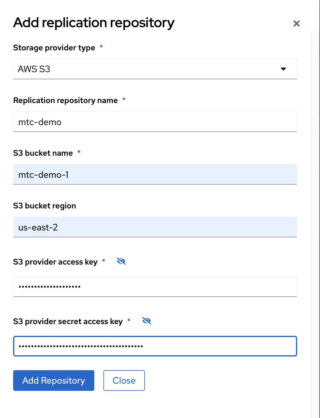 Now configure an AWS S3 object store to use as a replication repository. MTC copies the data from the OCP3 cluster to the replication repository, and then from the replication repository to the ROSA cluster. The AWS S3 storage bucket must be accessible to the source and target clusters. As you can seen from the AWS console we have created a S3 bucket called mtc-demo-1 to be used as the replication repository.