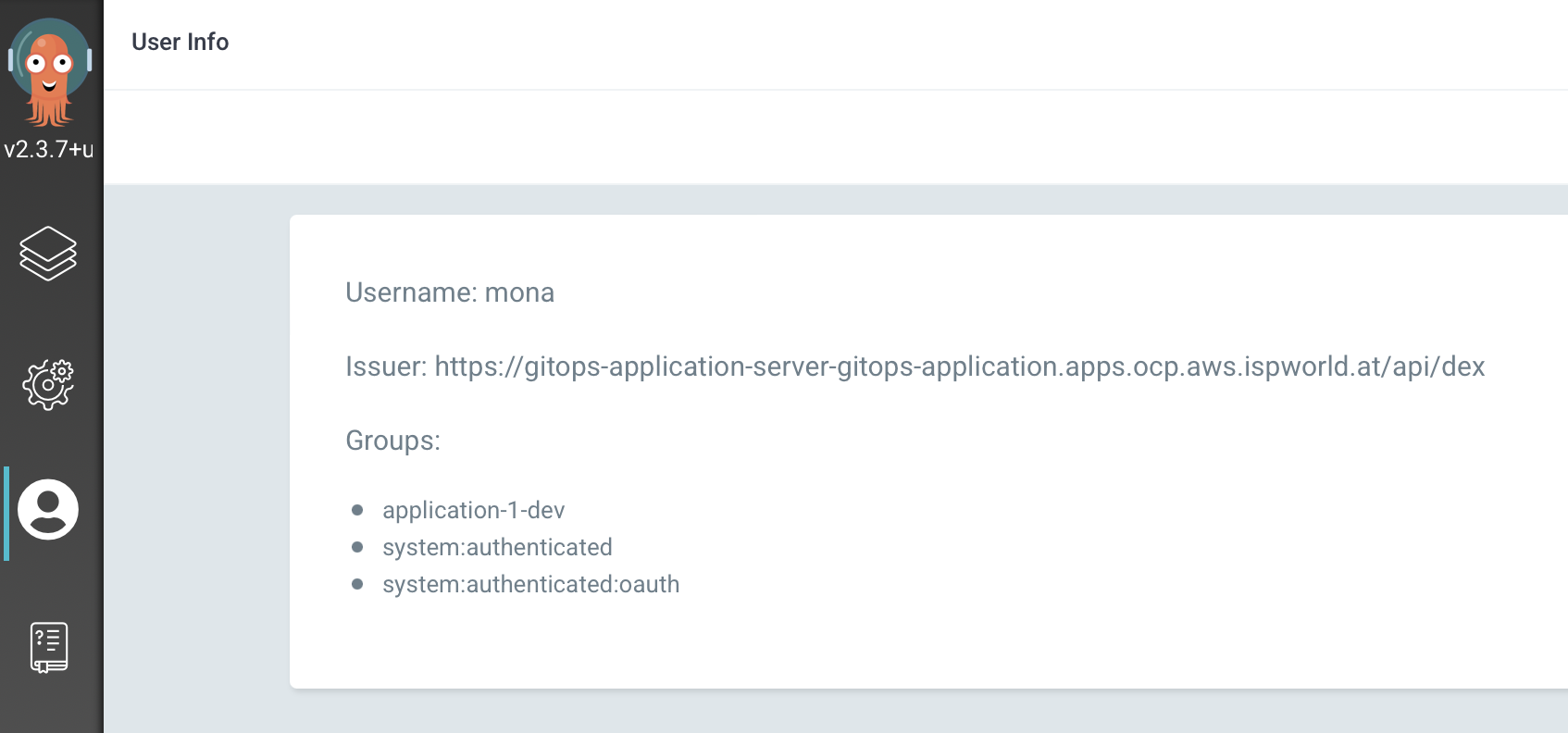 - Alice logs into the application Gitops instance and verifies that she is assigned to the correct group application-1-dev: