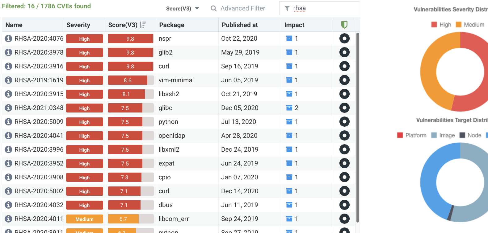 In the screen shot below, vulnerabilities discovered which are fixed by Red Hat are shown as their RHSA identifiers to indicate this are fixable vulnerabilities in the scanned image: