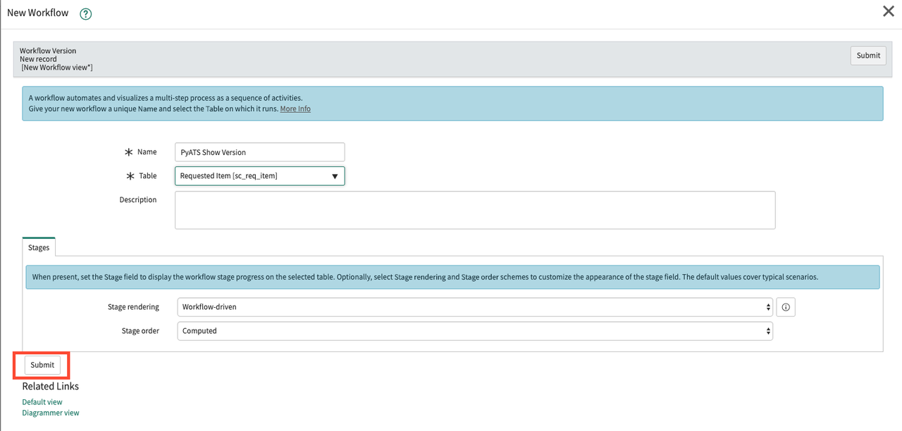 In the Process Engine tab, populate the Workflow field with the Workflow you just created. Click the Submit Button. You've not created a new catalog item!