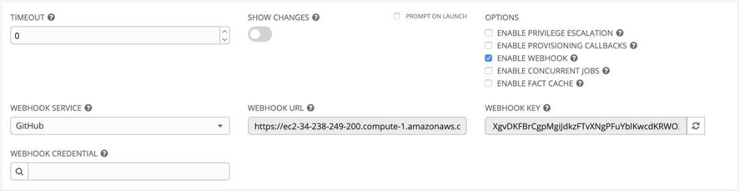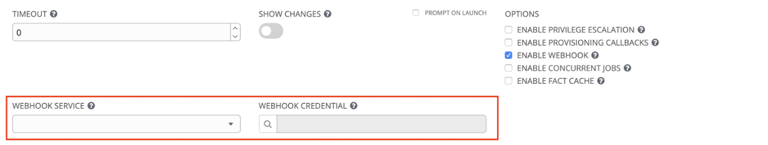 To enable an Automation Webhook for your job template, scroll down to the "Options" section and tick the "Enable Webhook" box. When you enable a Webhook, other related fields display, prompting for additional information to set up the Webhook source.