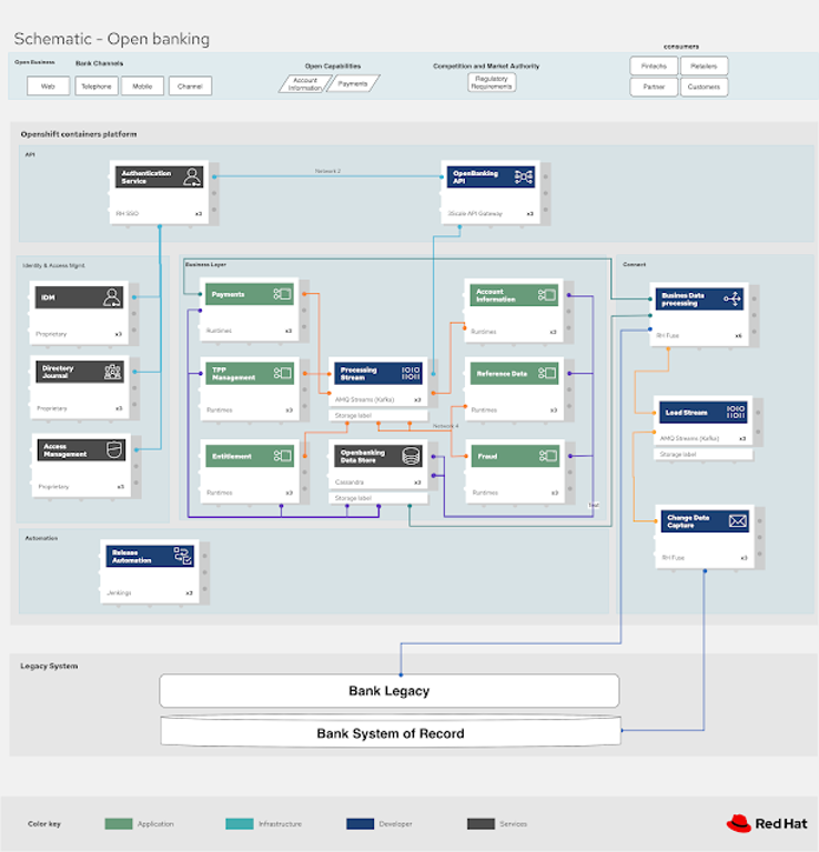 The use case is a cloud-ready, modular open source approach offering a wide range of technology options. It allows low-effort integration covering all aspects of an open banking implementation. (Note: this project is a new architecture and is currently in progress, so I am sharing one of the schematic architecture diagrams. You can monitor this project for updates as it progresses.)