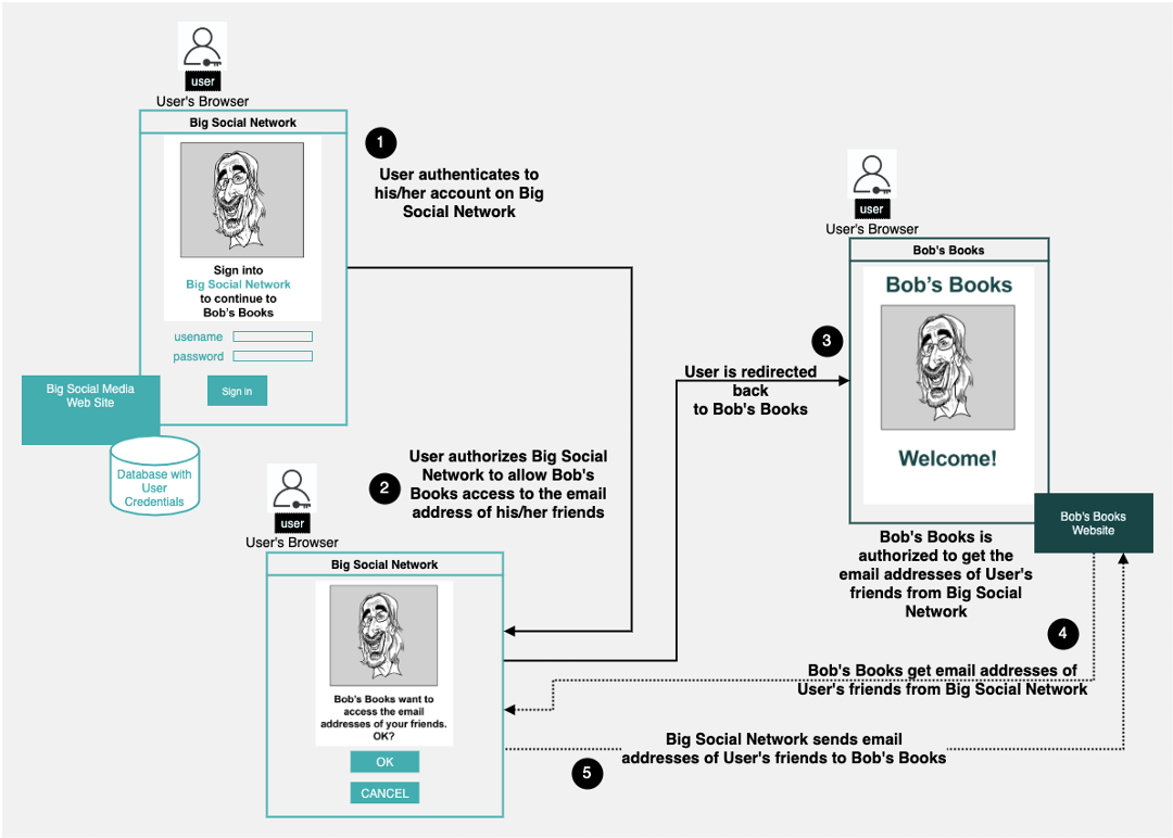 In Figure 3 above, callout 1, Mary is redirected from Bob's Books over to Big Social Network, where she enters her username and password. Big Social Network takes Mary's credentials and compares them to the username and password it has stored in its identity database. The credentials match up. Since Big Social Network knows Mary and it knows that Bob's Books want to gain access to the email addresses of Mary's friends, Mary is presented with Big Social Network's web page asking if Mary does indeed want to share the email addresses with Bob's Books. (Figure 3, callout 2). Mary gives Big Social Network permission to share the email addresses. Then, Big Social Network redirects Mary back to Bob's Books. As part of the redirection, Big Social Network inserts a token in the URL to Bob's Books that indicates that Mary is indeed known to Big Social Network. Bob's Books allows Mary access to the website. (Figure 3, callout 3.)