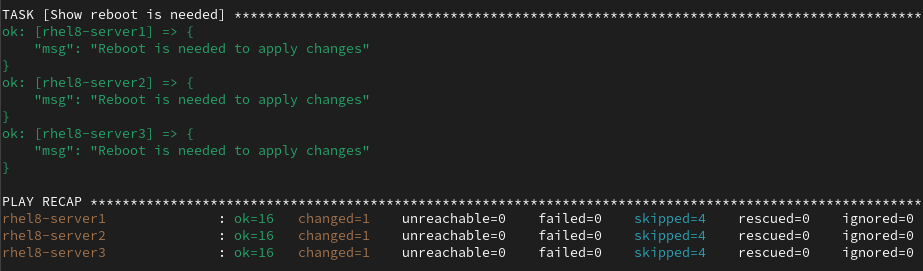 After the playbook completes, I verified that there were no failed tasks, and also note that it shows that a reboot is needed on all three of the hosts to apply the system-wide crypto policy changes.