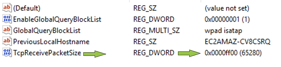 This can also be validated with the following Ansible Playbook. This will check the that the TcpReceivePacketSize value exists and is set to 0xff00.