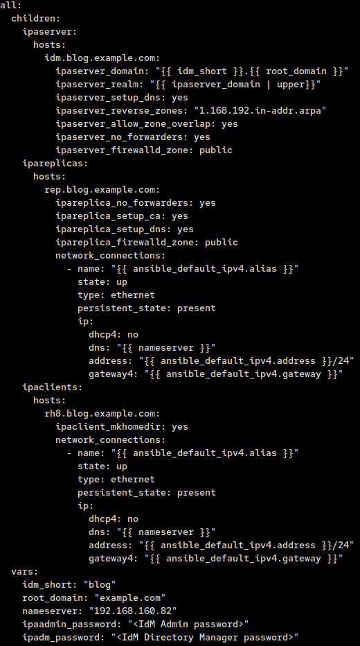 We will also be adding a few extra variables to help simplify any additions or changes to the playbook later on; idm_short, root_domain and nameserver. Both idm_short and root_domain will be joined to make our FQDN and the nameserver variable will be used to update our DNS and point to the IP of our primary IdM server.