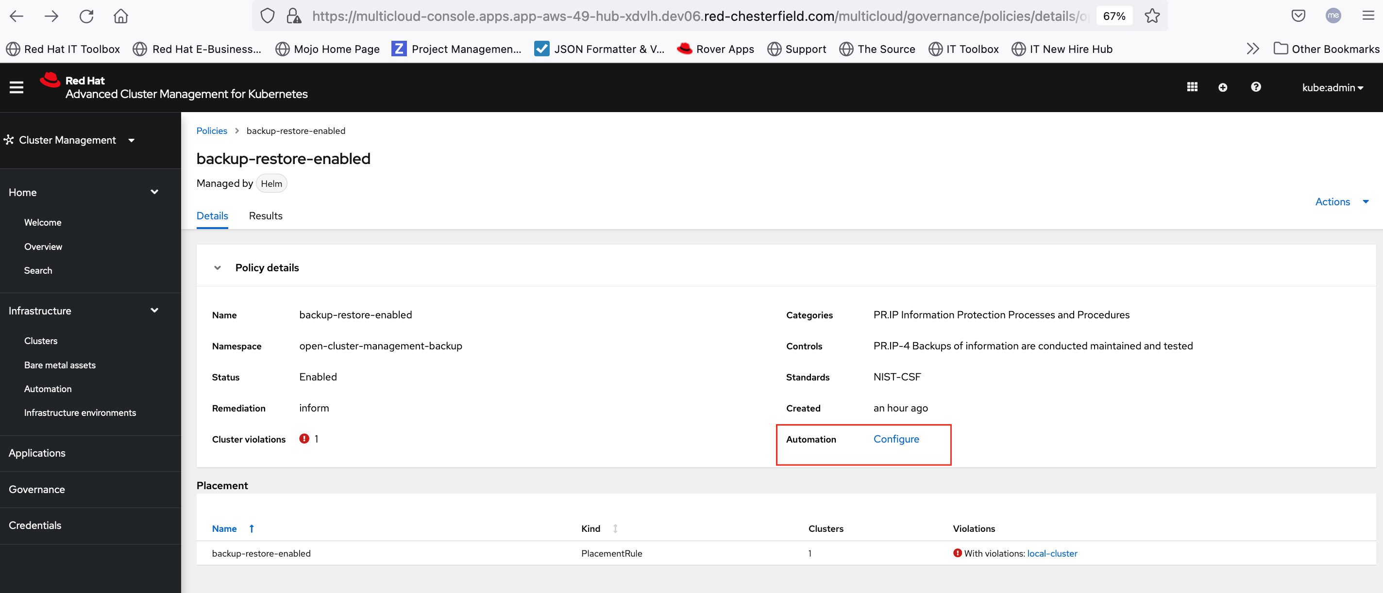 This policy is intended to help notify the administrator of any backup issues as the hub cluster is active, and expected to produce or restore backups. You can setup an automatic response to any of the policy violations by setting up an Ansible job with the following policy:
