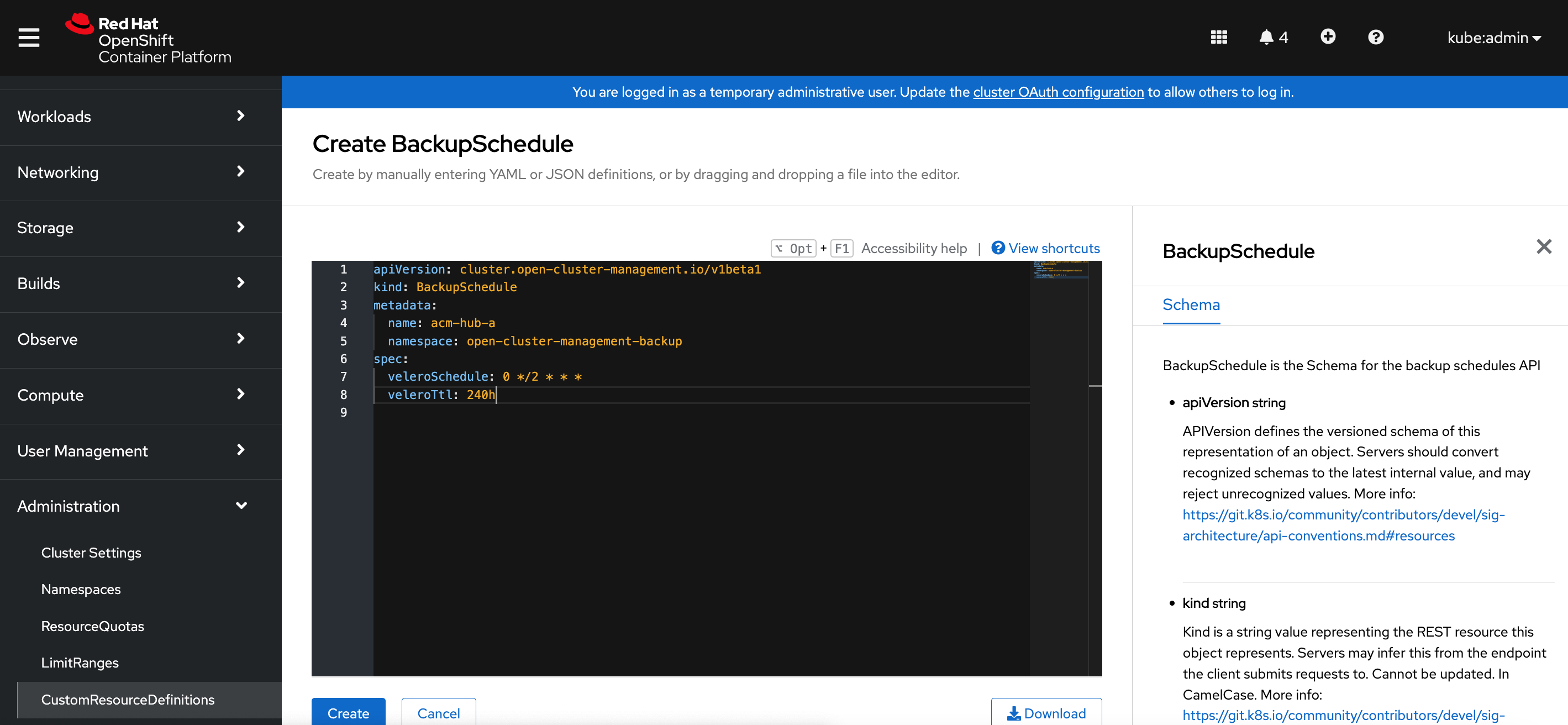 To enable a backup schedule on the active hub cluster, you have to create a BackupSchedule.cluster.open-cluster-management.io resource in the same namespace where the OADP Operator is installed. View the following image: