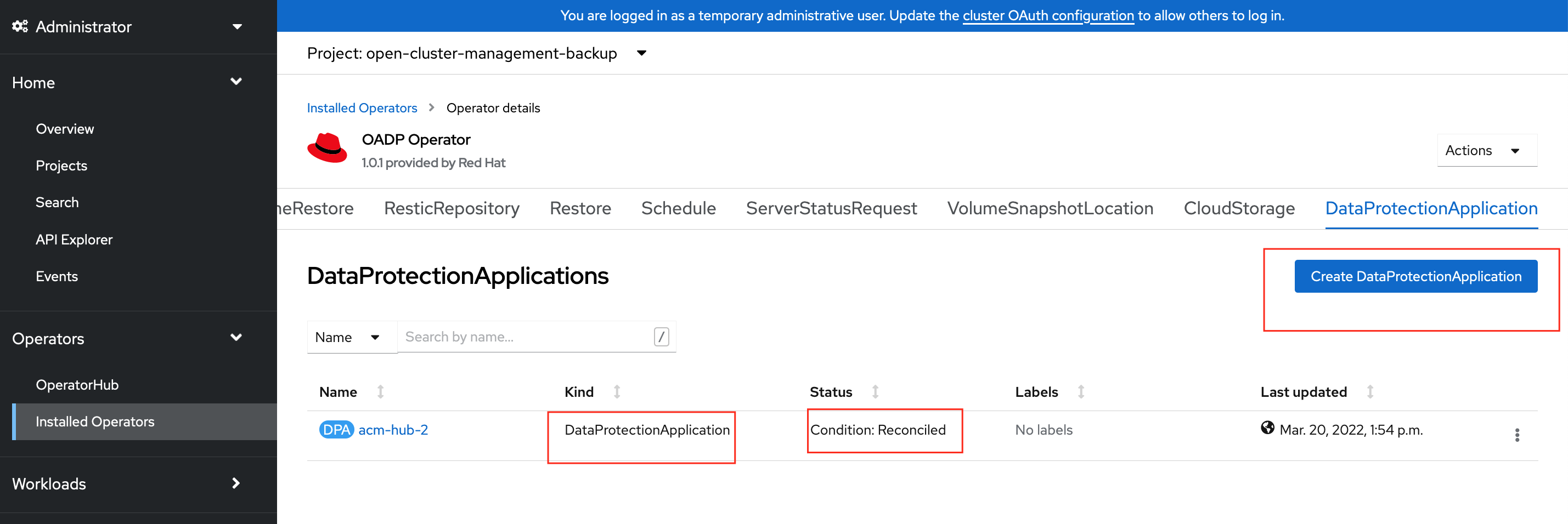 DataProtectionApplicationresource, and connect to the same storage location where the initial hub cluster has backed up data. - If the initial hub cluster has any other operators installed, such as