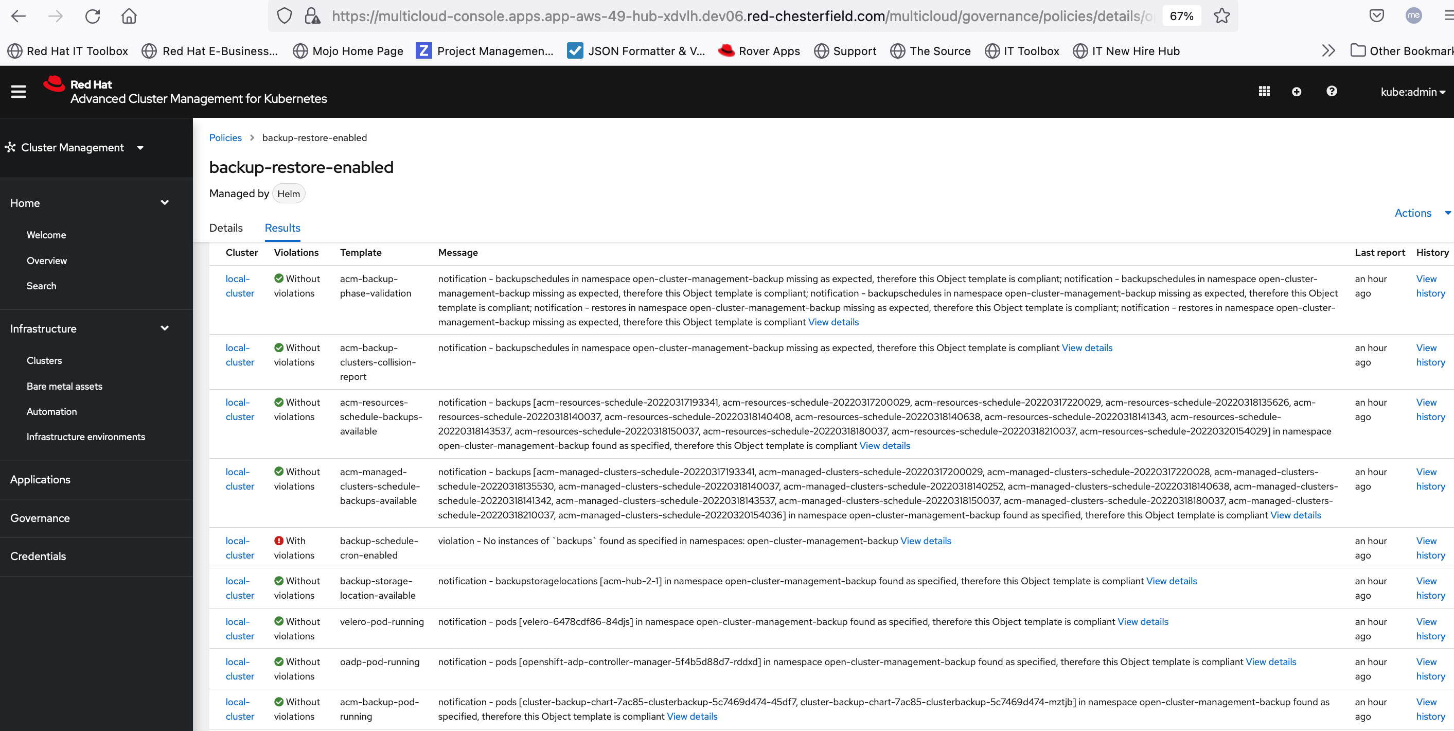 hub-backup-pod.yamlpolicy, which automatically reports when the backup solution is not functioning as expected, even if the main hub cluster is active and managing the clusters. This avoids the situation when backup data from the hub cluster becomes unavailable when the disaster hits.