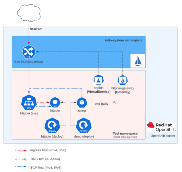 - Dual stack test: Finally, validate whether control and data planes are prepared for dual stack, verifying dual-stack DNS and TCP workflows from different points of the network