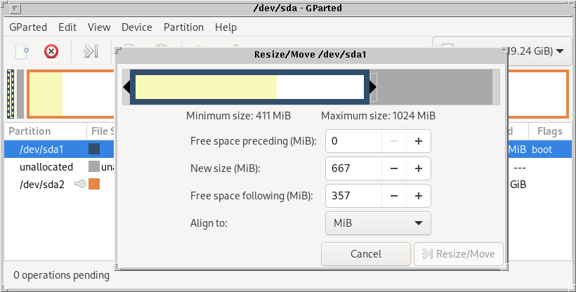 The ext4 filesystem got resized, but the partition is still 1Gib in size. You will resize it next. You will shrink the partition to a size slightly over that of the /boot file system to be safe from rounding errors. Shrink it to 700Mib, which will leave about 300Mib free. Since the filesystem inside that partition is now 512Mib, it is safe to shrink the partition from 1024Mib to 700Mib.
