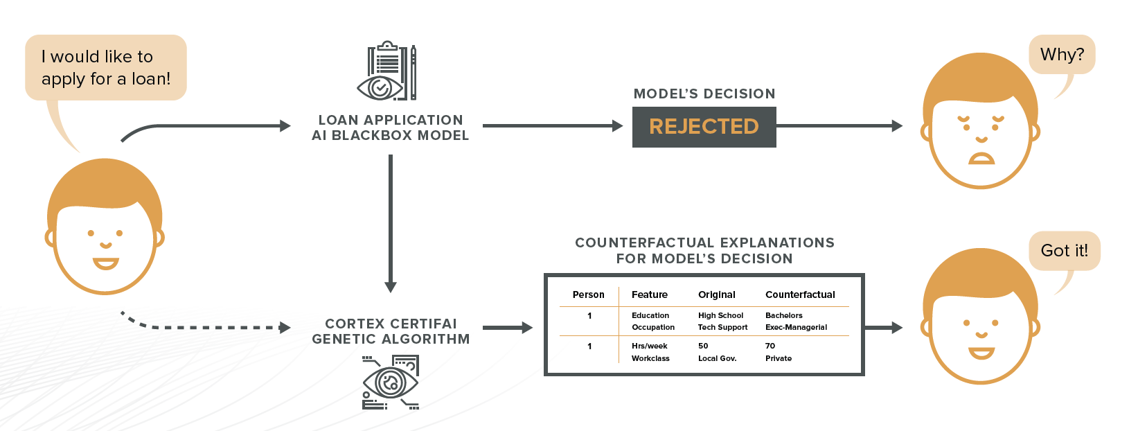 Image 1: An illustrative example of a loan application process, with Cortex Certifai producing counterfactual explanations for the AI system/model decision vs. a black box approach.