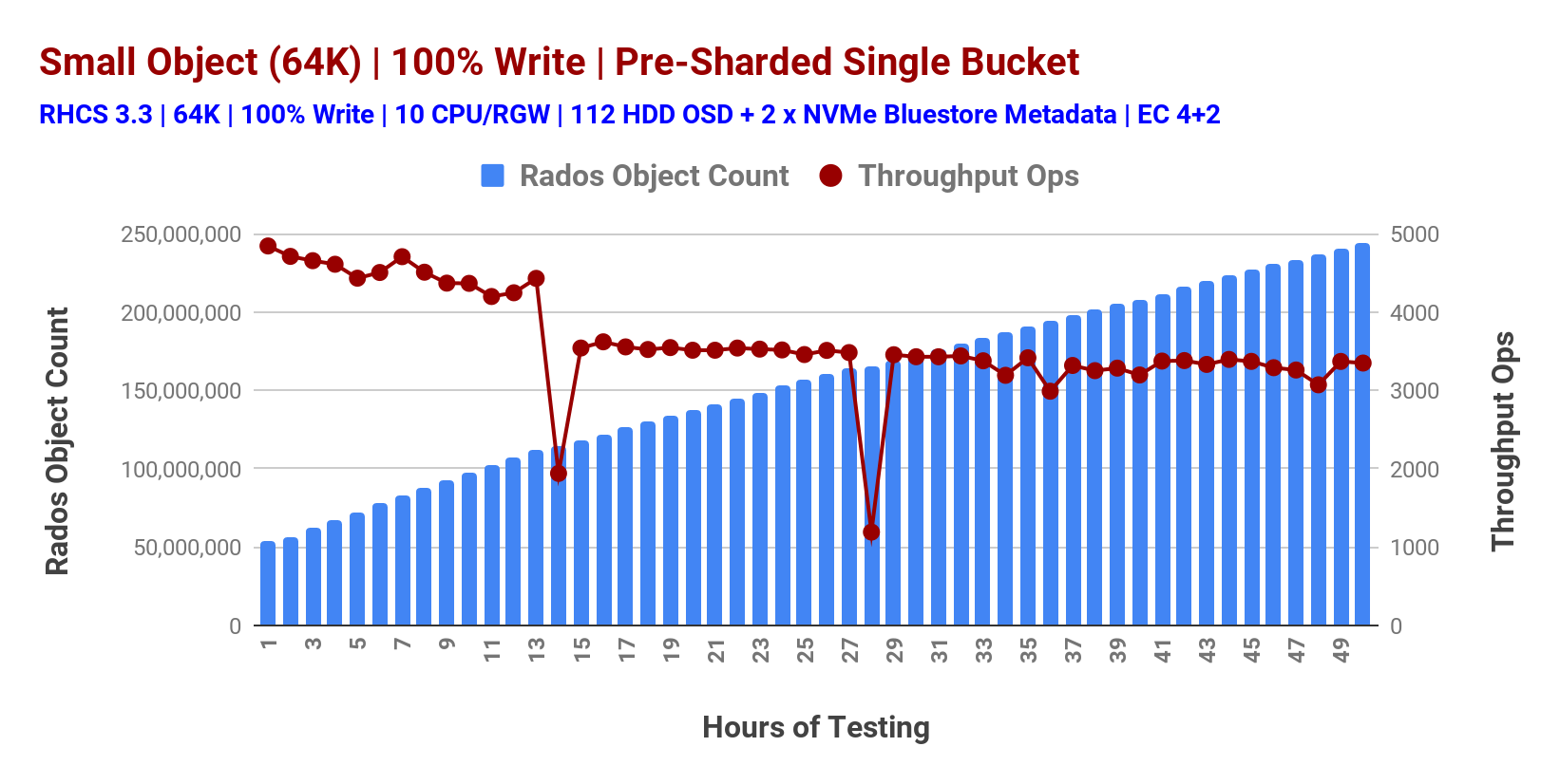 The non-deterministic performance with an overly populated bucket (Chart 1) leads us to the next test type where we pre-sharded the bucket in advance before storing any objects in it. This time we stored over 190 Million objects in that pre-sharded bucket and overtime we measured the performance which is shown in Chart 2. As such with the pre-sharded bucket we observed stable performance, however, there were two sudden plunges in performance at 14th and 28th hour of testing, which is attributed to RGW dynamic bucket sharding.
