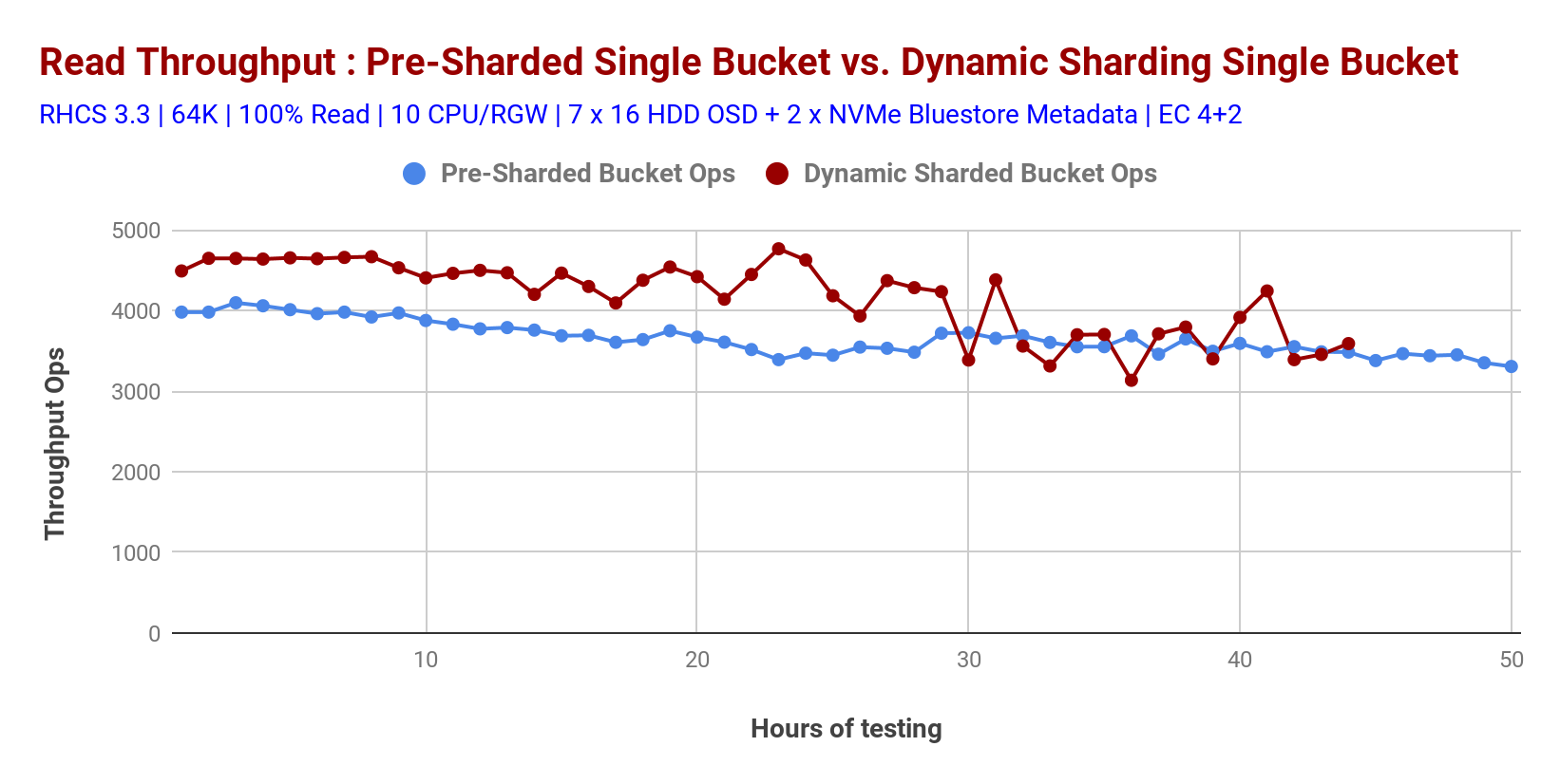 As explained above, dynamic bucket resharding is a default feature in RHCS, which kicks in when the number of stored objects in the bucket crosses a certain threshold. Chart 1 shows performance change while continuously filling up the bucket with objects. The first round of test delivered ~5.4K Ops while storing ~800K objects in the bucket under test.