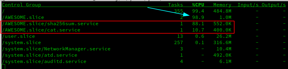 As you see in the screenshot below, the changes appear to be successful. sha256sum.service is configured for 2048 CPUShares, while md5sum.service has 1024. Finally, cat.service has 256.