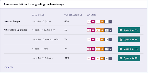 Snyk will provide alternative base image recommendations to dramatically reduce the number of vulnerabilities in your containers with a single change. For popular Docker images, there are often multiple alternative images available, but Snyk organizes them into minor, major, or alternative upgrades. This allows you to strike the right balance between an easier change and fewer vulnerabilities.