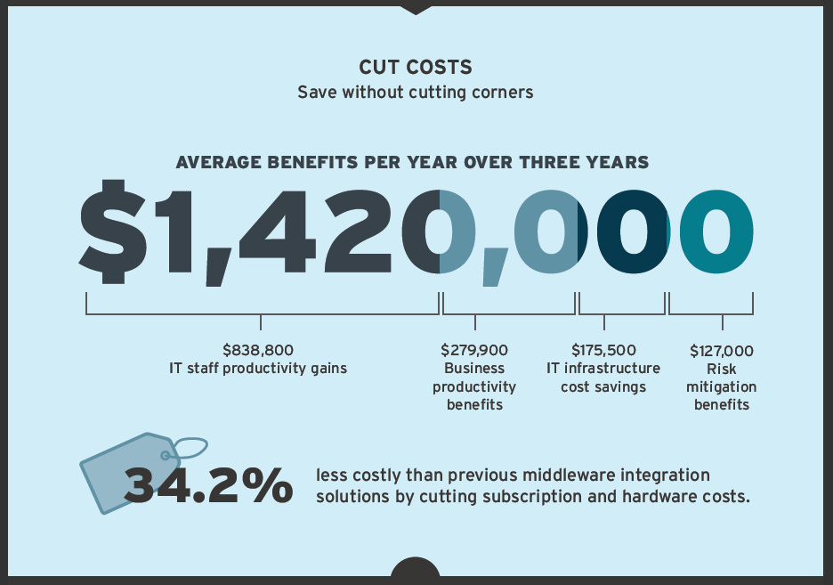 The most interesting thing that I saw is definitely part of that headline, but it's a smaller part of it -- over half ($838,800) of those annual savings come from making your IT staff more productive. When an application is integrated, it requires about 41% fewer staff to maintain it. There is a lot a variation here (defining integration is a whole 'nother blog post) but the idea of saving money, increasing individual productivity, and reducing the staff to maintain applications doesn't necessarily translate into cutting costs or reducing staff. The power of that, the core value of integration as I read it, is reallocating those precious resources to different operations for your company. Instead of keeping your current apps running, you could have a lot more available people and space to try to do new things, to reinvest in what your company does and move forward.