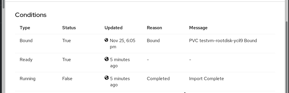 Scroll down to see its conditions. They show that the DataVolume got a PVC and it is running a pod to perform the transfer of the qcow2 image to the volume.