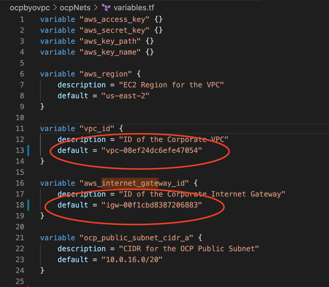Start by editing the ocpNets/variables.tf file. We need to update two variables in this file with the information you gathered above. Update the “vpc_id” and “aws_internet_gateway_id” with the information you gathered earlier. Also review the public and private subnet CIDRs to ensure that they are in the proper range you will be using:
