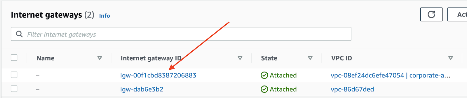 We are also going to need your existing Internet Gateway. While still in the VPC area select “Internet Gateways” from the VPC menu and record the Internet Gateway for the VPC you are using like so:
