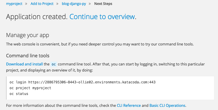 Leaving all other values as their defaults, click on Create and you will return to the Overview page for the project. Instead of Create Route, you should now see the URL by which the exposed application can be accessed from a web browser.